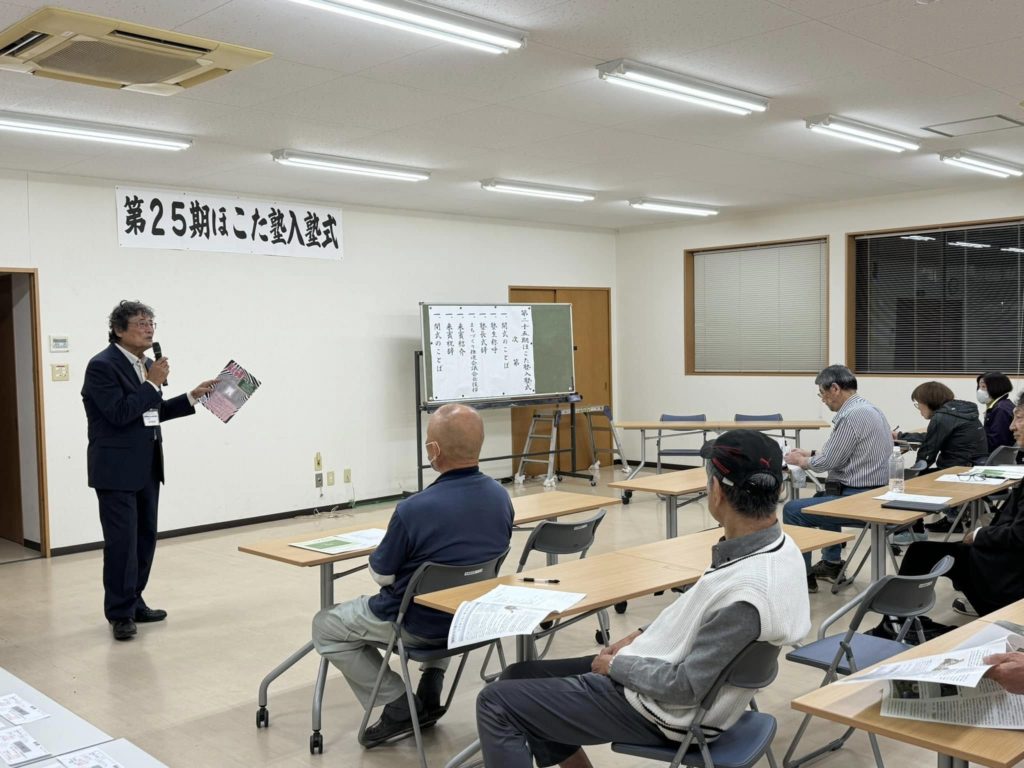 2024年10月24日、入塾式を行いました。塾生称呼、塾長式辞、まちづくり推進会議会長挨拶に続き、鉾田市より安原教育長のご挨拶をいただきました。今期は44名の入塾応募がありましたが、そのうち約半数が女性というこれまでにない記録が生まれました!入塾式の後にはオリエンテーションを行い、塾生各々に自己紹介をしていただきました。初めての参加者も多く、また20代、30代の方もいて、今後の展開に期待が膨らみます。これから2月まで、講座を開催します。引き続き入塾希望者を受け付けていますので興味のある方はぜひご参加ください。単発の講座の受講も可能です。